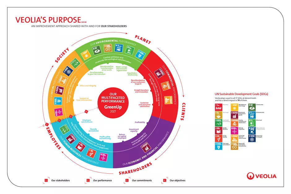 Founded and designed for the long term, Veolia's purpose is a compass that helps us set and maintain our course over time. It is a shared progress approach that involves all Group employees and benefits all stakeholders. It is implemented in our 国际新利娱乐网官网 , driven by a vision of multifaceted performance which places the same level of attention and requirements on economic and financial, commercial, social, societal and environmental performance. Our ambition is to make Veolia the benchmark company for ecological transformation.