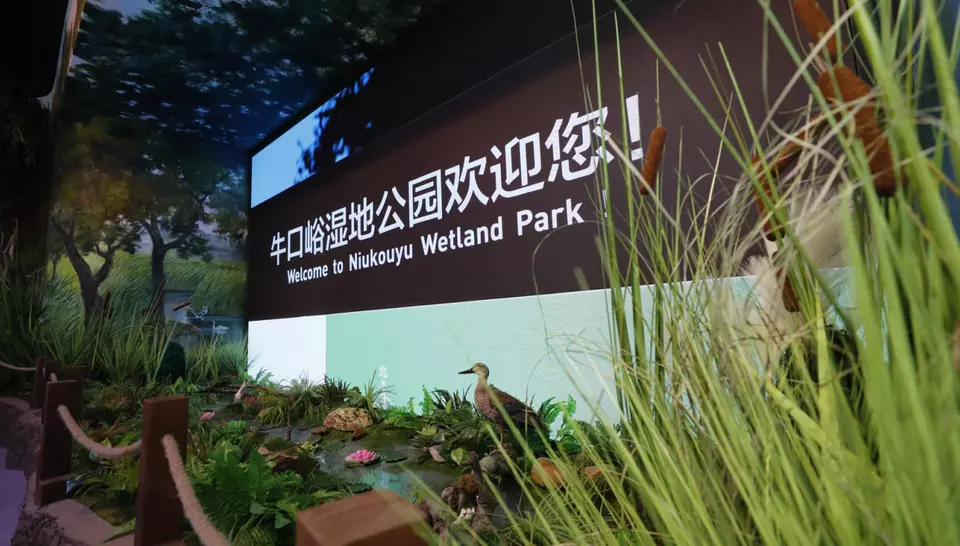 The transformed exhibition hall is defined as an immersive ecological wetland environment experience space. Walking into the Niukouyu Wetland Park Exhibition Hall, you will see lots of greenery such as aquatic plant specimens of reeds, spring onions, water lilies etc. set up in real scene to complement with the large painting of forest landscape on the wall. A wide variety of pictures of wild birds and real bird specimens are placed together to create a lifelike and eye-catching scene. The sound of gurgling water and the chirping of birds like what you will hear in a spiritual valley provide a temporary escape from reality and take you to a mysterious fairyland. The big screen facing visitors shows videos and images of all kinds of rare bird species inhabiting the wetland park in a loop, capturing our heart.