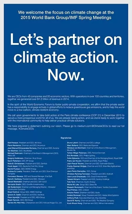 They will all sign an open letter to be sent to world leaders, inviting them to take hands-on decisions at the climate "COP 21" climate conference. Veolia CEO, Antoine Frérot, acting on behalf of our Group, is one of the members of the call "Let's Partner on Climate Action. Now. " published and relayed in the Financial times.