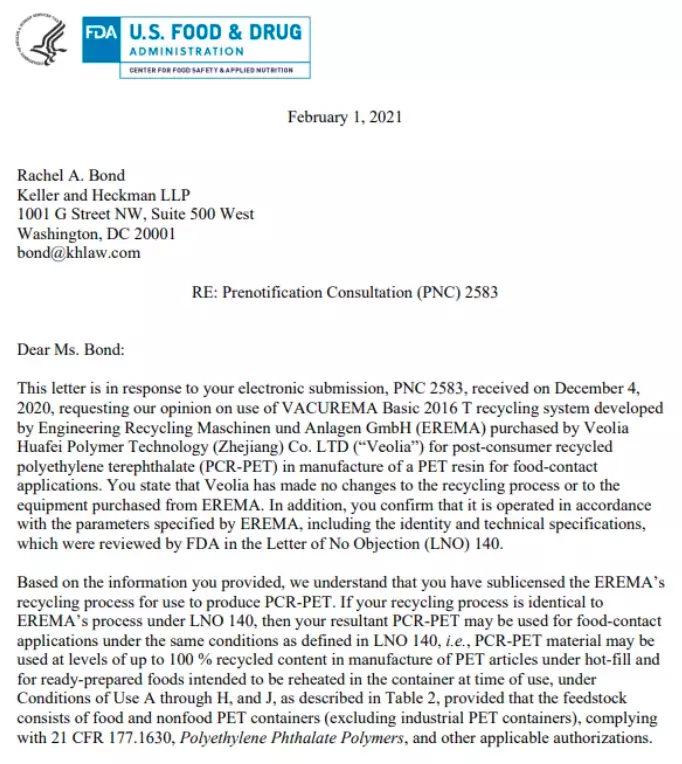 On February 1, 2021, Veolia Huafei Polymer Technology (Zhejiang) Co., Ltd. received a certificate from the Food and Drug Administration (FDA) to validate the production system of recycled polyester (PCR-PET) has obtained the official approval of the US FDA.
